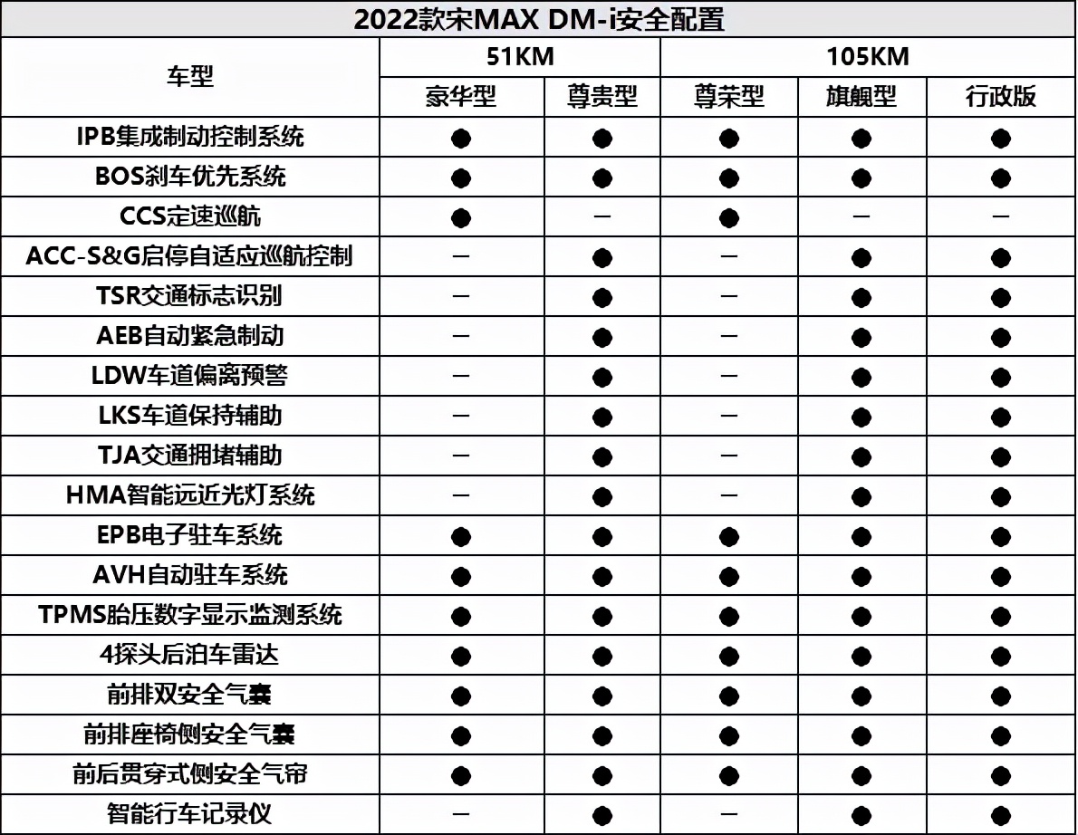 2022款宋MAX DM-i的安全配置也相当丰富,全系标配自动驻车、胎压数字显示、全车6个安全气囊(包括前后贯穿式侧气帘)等配置,而51公里尊贵型、105公里旗舰型、105公里行政版车型更是配备了DiPilot智能驾驶辅助系统,ACC-S&G全速域自适应巡航、预测性紧急制动系统、车道偏离预警、车道保持辅助等深受用户喜爱的功能一应俱全,为安全出行保驾护航。