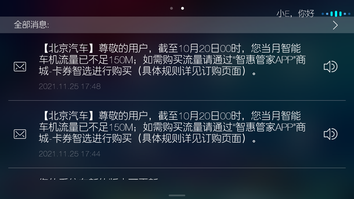 本次OTA升级后,当车机流量即将用完时,车机会弹送信息提醒,车主可以扫码下载“北京汽车APP-商城”(原智惠管家APP)进行流量购买。
