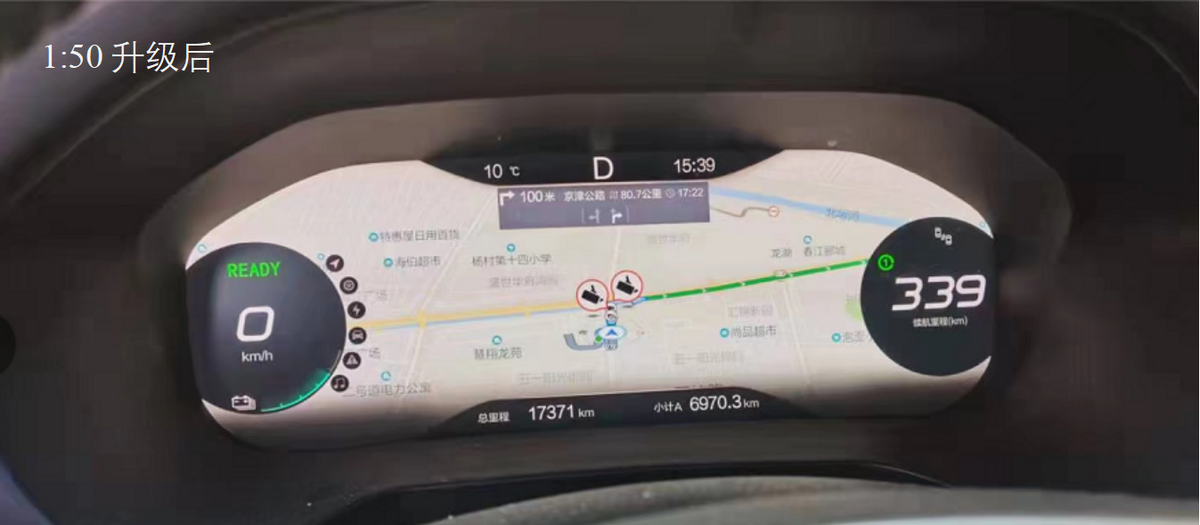 导航功能升级则将仪表导航地图显示比例由1:20增大至1:50,新的比例尺相较升级前可以显示更多车辆当前行驶路线的宏观信息,驾驶员在仪表台可以看到更全面的道路信息。让驾驶者对车辆的整体行驶路况了然于胸,提前作出预判,避免错过路口等尴尬情况发生。