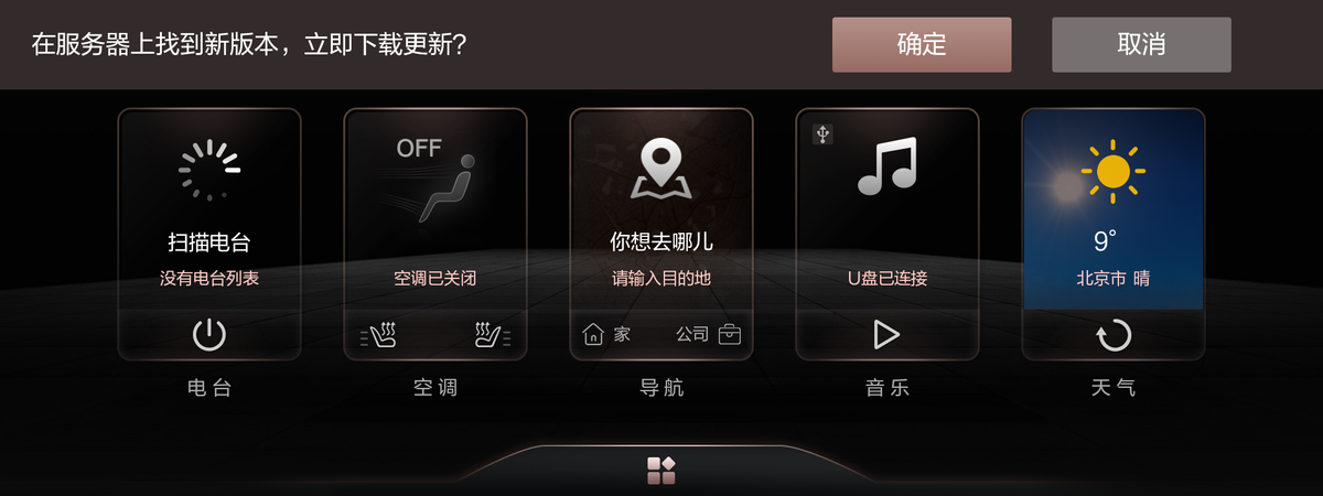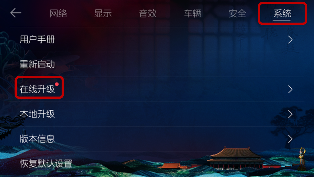 当升级弹窗弹出时,车辆正在行驶过程中。北京EX3/北京EX5/北京EU5车型的车主则可以通过车机主页,依次点击“设置-系统-在线升级“,看看是否收到车机升级通知,如果收到,依次点击“更新-确定”,等待下载完成后点击“现在重启”,等待车机升级完成。