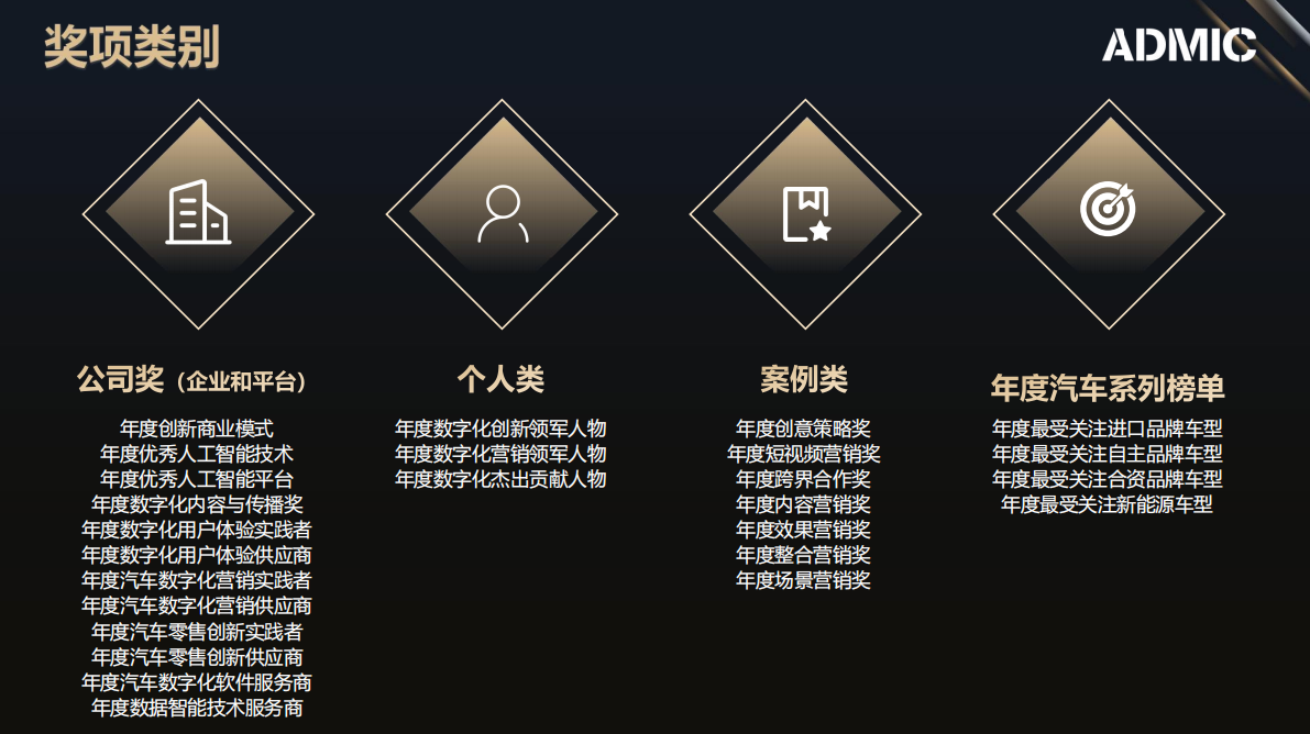 此次ADMIC共设置四大奖项类目 --- 公司奖、人物奖、案例奖、年度汽车系列榜单。涵盖当下主流的数字化营销细分领域及数字化创新技术类目。通过行业全渠道裂变,征集最具代表性、前瞻性和杰出贡献的项目实践案例、技术与平台。