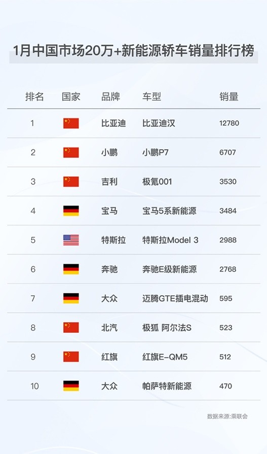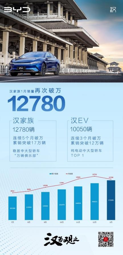最新出炉的销量数据显示,比亚迪汉1月迎来开门红,其销量再次破万,达12780辆。其中,汉EV 1月销量为10050辆,汉DM 1月销量为2730辆,保持持续热销。截至2022年1月,比亚迪汉车型累计销量已经突破17万辆,连续5个月月销破万,稳居中大型轿车“万辆俱乐部”,并长期占据中大型新能源轿车市场TOP 1和中国品牌中大型轿车销量TOP 1。根据乘联会数据,1月比亚迪汉在中国售价20万以上的新能源轿车销量排行榜上位列第一。
