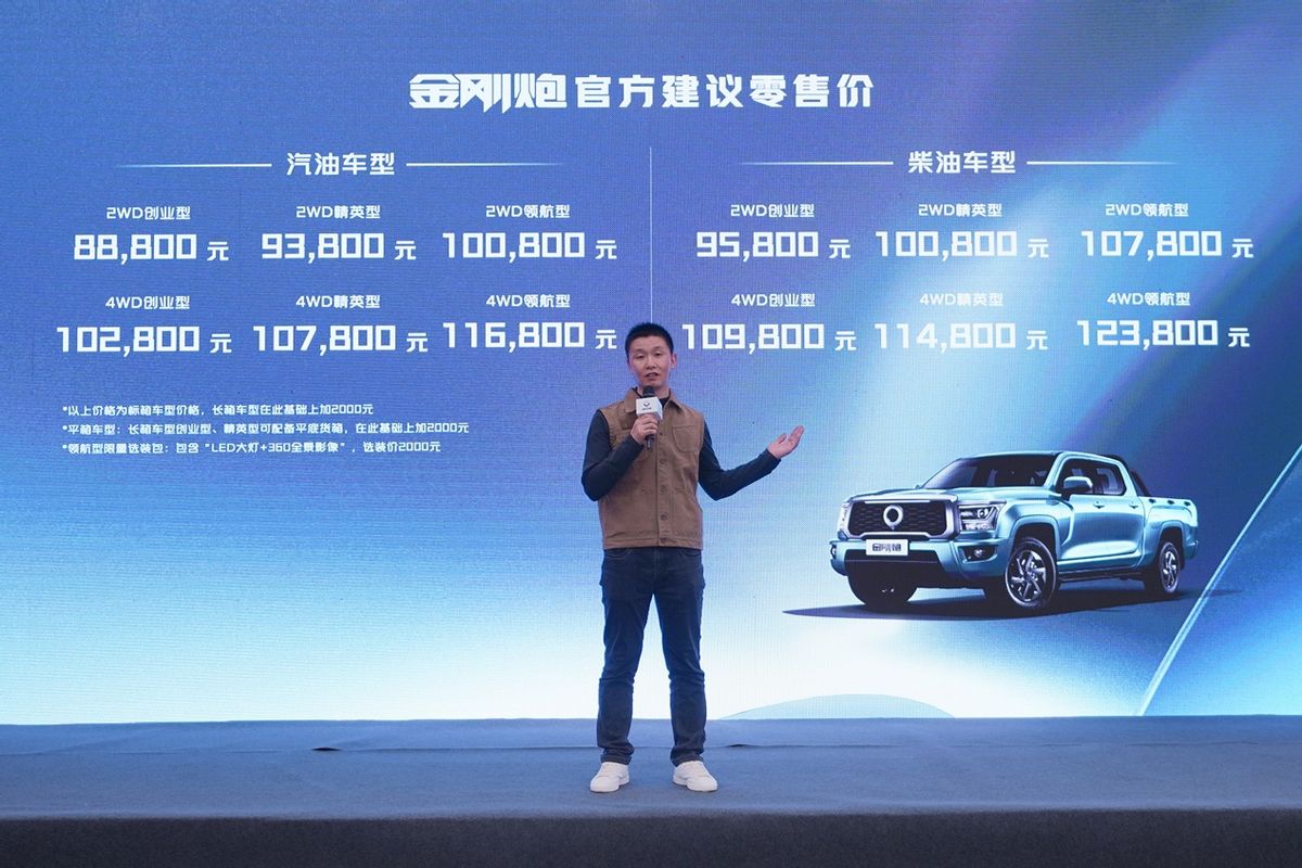 金刚炮拥有汽油、柴油两种动力,两驱、四驱多种不同版本,汽油车型8.88万元起,柴油车型9.58万元起。