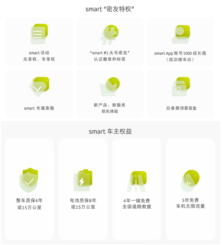 去年五月,smart发布旗下潮趣生活方式品牌smartidea,让万物皆可smart。此次发布会上,smart发布“#1头号密友计划”,为所有“预订车主”自动解锁该活动参与权限。通过参与smart共创活动,密友们可获取并积累“成长值”。最终成为 “#1头号密友”的预订车主,可享受六大惊喜福利,包括smart活动先享权、专享权;“#1头号密友”认证徽章和标签;smart APP账号1000成长值(成功提车后);专属客服;新车优先内测权益;后备箱惊喜盲盒。此外,smart还将为所有车主提供四大重磅权益,包括整车质保4年或15万公里;电池质保8年或15万公里;4年一键免费全国道路救援;5年免费车机无限流量。