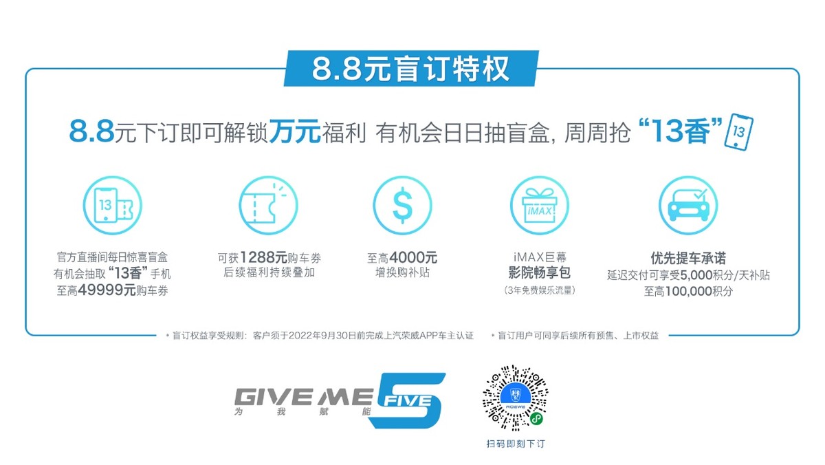上汽乘用车公司副总经理孙亦炯化身“威5超感宠粉官”,揭晓双车盲订价格,并公布“威5超感宠粉计划”,8.8元下订即可解锁5大特权万元福利,包括官方直播间每日惊喜盲盒(有机会抽取“13香”手机、至高49,999元购车券)、1288元购车券(后续福利持续叠加)、至高4000元增换购补贴、iMAX巨幕影院畅享包(3年免费娱乐流量)、优先提车承诺等,美好的智慧出行生活触手可及。