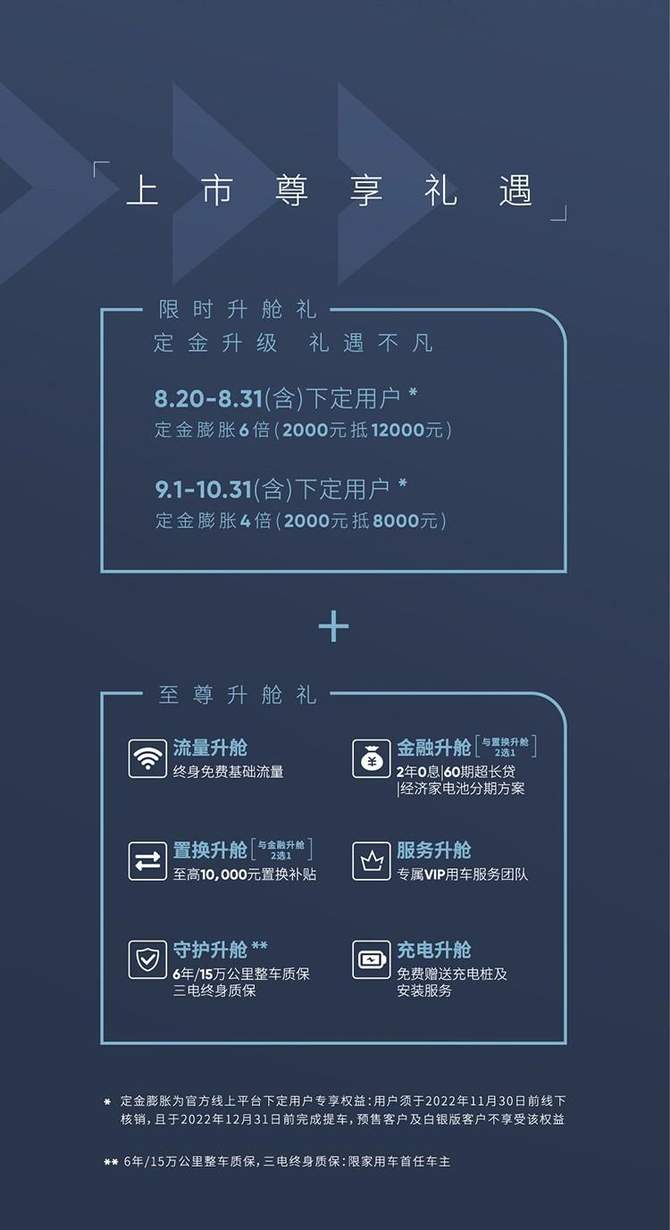 自即日起至2022年10月31日,通过上汽荣威APP、上汽荣威官方抖音平台下定,用户即可享受“限时升舱礼”。8月20日-8月31日(含)下定,可享2,000元抵12,000元购车款;9月1日-10月31日(含)下定,可享2,000元抵8,000元购车款。此外,中国荣威悉心为用户准备了丰厚的“至尊升舱礼”,包含流量、金融、置换、服务、守护、充电六重升舱礼遇,助力用户开启美好的智能纯电出行生活。