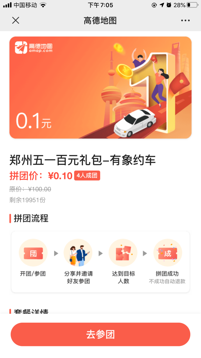 现在扫描下方二维码进行开团购买,便可花费0.01元获得价值100元的乘车大礼包!乘坐有象约车,快乐五一游!