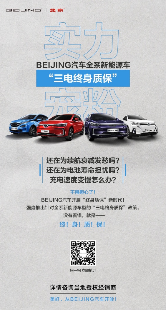 BEIJING汽车还针对旗下新能源车型推出了三电终身免费质保服务,让你买车无忧,用车放心!