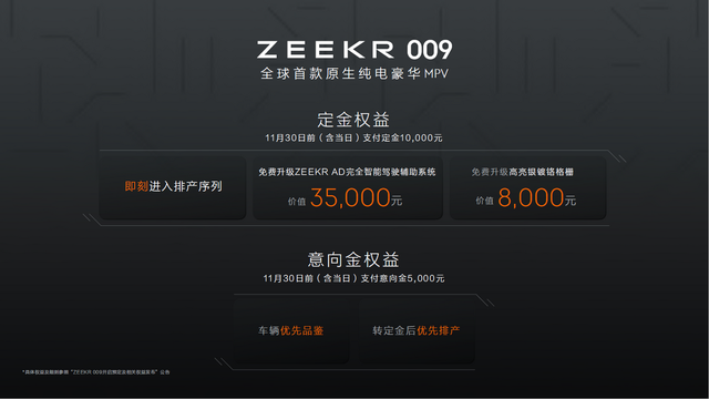 定金权益:11月30日前(含当日)支付定金10,000元,即刻进入排产序列。免费升级价值35,000元ZEEKR AD完全智能驾驶辅助系统,免费升级价值8,000元高亮银镀铬格栅。