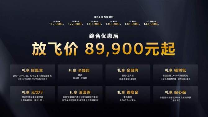 2023年2月13日,新起亚K3在鹭岛厦门正式上市。起亚精心为中国消费者带来了礼享·膨胀金、礼享·全额险、礼享·金融购、礼享·福利包、礼享·无忧行、礼享·浪漫购、礼享·置换金和礼享·贴心保八重礼遇。新车共推出6款车型,官方指导价为11.29万元-14.39万元,综合优惠后“放飞价”仅8.99万元起。新K3定位驾趣新生代家轿,产品实力全面进阶,旨在为年轻家庭带来高品质出行体验。