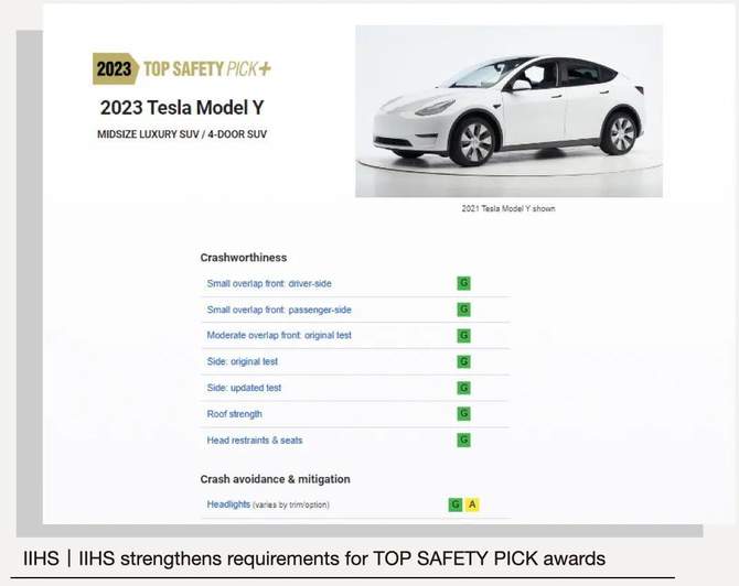 近日,美国公路安全保险协会(IIHS)公布2023年“最高安全”(Top Safety Pick+)车型获奖情况,特斯拉Model Y再度摘下这一殊荣。特斯拉旗下车型,已连续五年获得美国公路安全保险协会(IIHS)安全大奖。特斯拉一直将出行安全视为产品设计的重中之重,得益于“设计以安全为先”的造车理念,S3XY全系车型屡获“五星安全”肯定,这也意味着特斯拉正在树立“新的安全技术基准”,引领整个汽车行业向着更高的安全维度迈进。