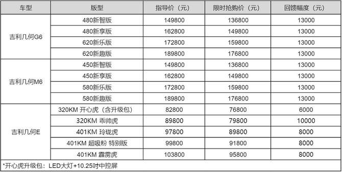 近期,碳酸锂等原材料价格回归理性,进一步利好新能源汽车行业整体发展。新能源成本下调,吉利几何第一时间选择让利回馈用户4月1日-4月30日,吉利几何G6/M6/E三款车型开启“真补贴,不套路”限时回馈补贴活动吉利几何G6/M6至高补贴13000元,吉利几何E至高补贴10000元,实实在在地以真金白银回馈用户支持,助力更多用户轻松享受高品质出行。