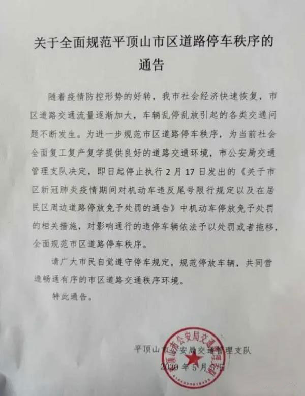 从平顶山市公安局交通管理支队获悉,5月5日起,平顶山市将全面停止疫情期间机动车停放免予处罚的相关措施。