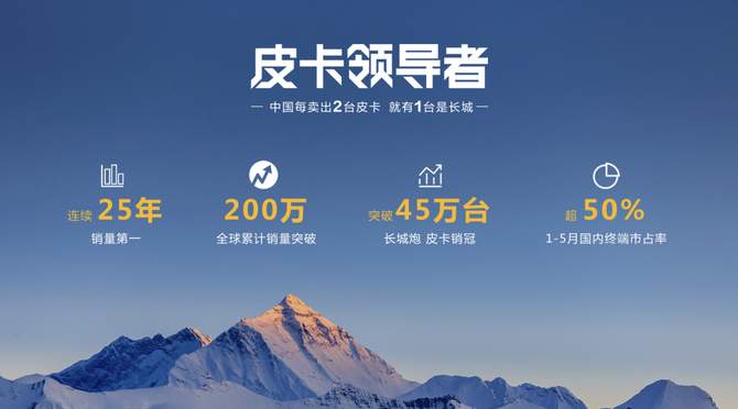 作为皮卡领导者,长城皮卡连续25年销量第一、全球累计销量突破200万,2023年1-5月市场占有率突破50%;长城炮上市三年多,累计32个月销量过万,稳居国内皮卡市场第一,成为首个突破45万台的中国高端皮卡品牌。