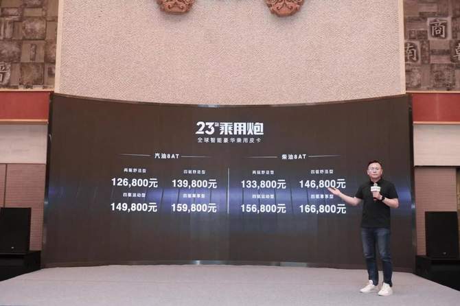 2023款乘用炮汽油车型官方指导价为12.68万元-15.98万元,柴油车型官方指导价为13.38万元-16.68万元。同时,购车用户还将享受金融礼、置换礼、互联礼、服务礼、推荐礼五重大礼。增配不加价 诚意满满!