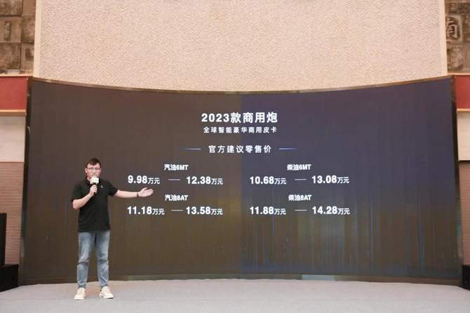 2023款商用炮汽油车型官方指导价为9.98万元-13.58万元,柴油车型官方指导价为10.68万元-14.28万元;另外,购车用户还可享受金融礼、置换礼、服务礼、推荐礼四重大礼!物超所值!