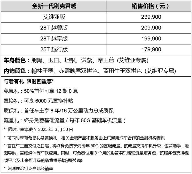 2023年6月10日,越级科技座驾全新一代君越郑州发布会,在郑州国际会展中心举行。新车提供四个版本车型,分别是艾维亚版(23.99万元)、28T越尊版(20.99万元)、28T越享版(19.99万元)、25T越行版(17.99万元)。