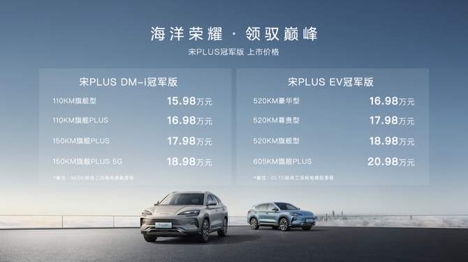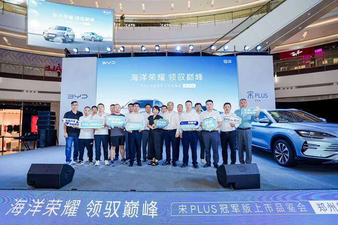 7月22日,海洋荣耀 领驭巅峰-宋PLUS冠军版上市品鉴会·郑州站在华润万象城隆重举行,比亚迪海洋网重磅冠军车型宋PLUS冠军版在河南正式上市,其中宋PLUS DM-i冠军版共4款车型,售价15.98万元-18.98万元,宋PLUS EV冠军版共4款车型,售价16.98万元-20.98万元。同时为用户准备了2年0息、置换补贴、充电桩、首任车主非营运车辆三电终身保修等多项购车好礼,让冠军产品惠及更多用户。