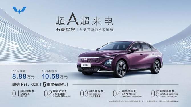 即日起至2024年1月31日,用户可通过五菱汽车APP、五菱汽车小程序、天猫、抖音等线上渠道下订,即可享“5重星光豪礼”,包括超足置换礼:享3000元置换补贴;超省贴息礼:享24 期0利息,至高4000元金融贴息;超长质保礼:首任非营运车主三电终身质保;超优充电礼:赠3.5kW充电桩(具备安装条件,150进阶版专享);超爽流量礼:享3年免费智能车机流量(2GB/月,150进阶版专享)。