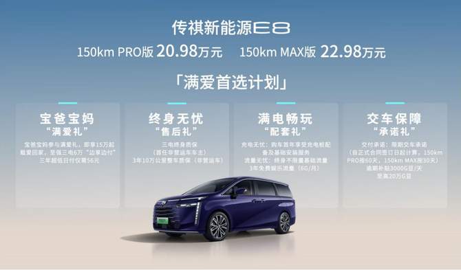 “易驾”更“宜家”,传祺新能源E8的到来,开创了家用车由MPV主导的3.0时代,引领了全新的满爱车生活。它是中国家庭守外安内的大平层,装下一家人满满的需求和期待,是家庭更聪明、更贴心的最“家”陪伴。大空间、高智商、易驾控、超值性价比,传祺新能源E8的魅力不限于此,未来也将陪伴用户,挖掘更多出行生活的惊喜。