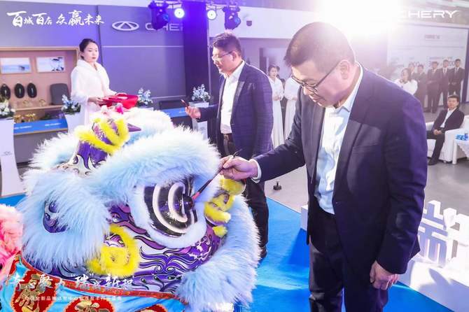 雄狮献瑞,愿展宏图。伴随着欢快的音乐,各位领导嘉宾纷纷上台,共同为象征着祥瑞的金狮点睛。祥狮苏醒,焕发出勃勃生机。在振奋的舞狮表演后,奇瑞汽车郑州盈丰体验中心总经理王芬女士接过了奇瑞厂家颁发的授牌。