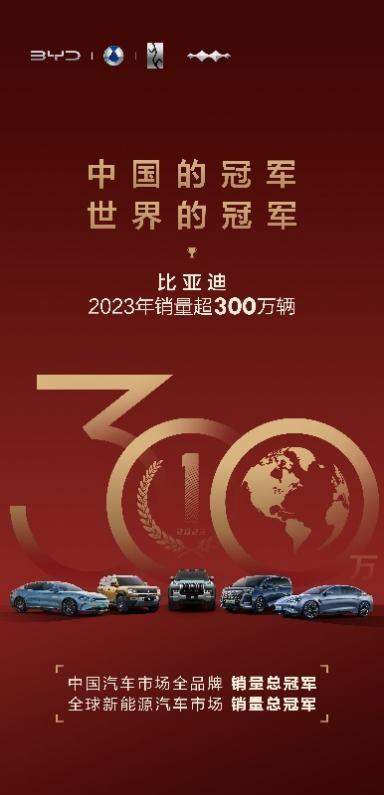 比亚迪从2021年的74万辆,到2022年的186万辆,再到2023年的302万辆,如此大体量之上的高速增长,比亚迪既是中国唯一,更是全球唯一,是中国汽车百年奋进的辉煌成就。这也帮助比亚迪从中国车企销量第一,到中国品牌销量第一,再到蝉联世界新能源销量第一,这是新能源时代创造的奇迹,证明了中国汽车未来的无限可能,也是比亚迪为全球新能源汽车行业发展交出的圆满答卷。未来,比亚迪会继续坚持用技术创新满足人们对美好生活的向往,引领汽车行业转型新能源。