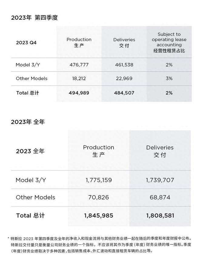 2023年全年,Model 3与Model Y交付了超173.9万辆,生产超177.5万辆。2023年第四季度,特斯拉在全球生产了约49.5万辆电动车,交付了超过48.4万辆电动车。
