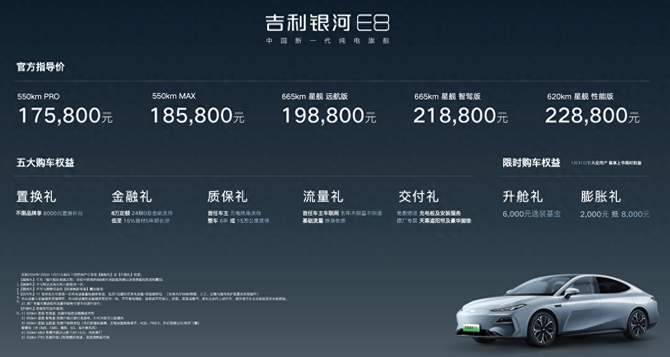 又到春节前购车热潮,基于SEA架构打造的5米宽体纯电轿车吉利银河E8吸引了很多用户的目光,堪称过年必看、最值得入手的B级车。银河E8共推出5个版型,续航分别达到了550km、620km 、665km,售价区间17.58万元-22.88万元。五大版型该如何选择呢?今天,小编就结合不同版型的具体配置,为大家介绍下吉利银河E8该如何选购。