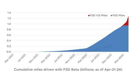 马斯克曾表示,60亿英里行驶里程是一个完全自动驾驶系统实现质变的重要节点。2024年第一季度,特斯拉FSD完全自动驾驶真实路况总里程已达12.5亿英里(约20亿公里),这一数字远超其他公司总和。