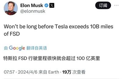 特斯拉完全自动驾驶累计里程不久将超100亿英里