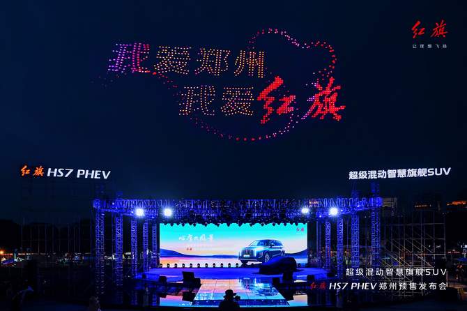 红旗HS7 PHEV魅力亮相的热潮正盛,夜空视觉盛宴更将现场氛围拉至顶格。“华夏之源”郑州与“中国汽车工业的旗帜”红旗品牌为贺盛世华诞,在千架无人机的组合展演中联袂“霸屏”郑州之夜。无人机排列出的“我爱郑州,我爱红旗,我爱中国”字样,将现场氛围推至最高潮。在场观众的爱国情怀在此刻不约而同地迸发,汇聚成与国同梦、共迎华诞的澎湃之势。