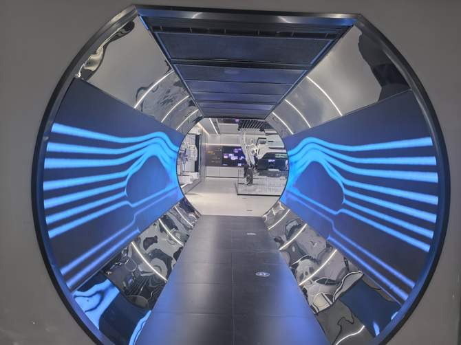 二层是匠心智造空间,主要展出比亚迪目前主打的智能制造内容,例如有一条圆柱形光隧道对准一辆被拆成零部件的汽车,所有零部件悬空吊装展示,可让观众近距离观看一辆新能源汽车的精细构成。