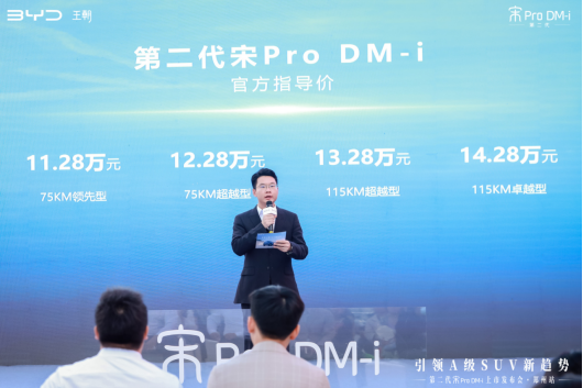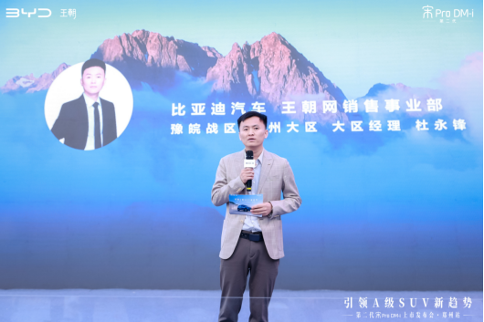 随着主持人的宣布,发布会正式拉开帷幕。比亚迪汽车王朝网销售事业部豫皖战区郑州大区大区经理杜永锋登台致辞,他回顾了比亚迪及宋Pro DM-i系列在市场上的卓越表现,并表示此次推出的第二代宋Pro DM-i,在继承前代车型优秀品质的基础上,进行了全面的升级和优化。新车搭载了比亚迪最新的第五代DM技术,实现了更低的油耗和更高的续航能力,百公里综合油耗低至3.79L,续航能力大幅提升。