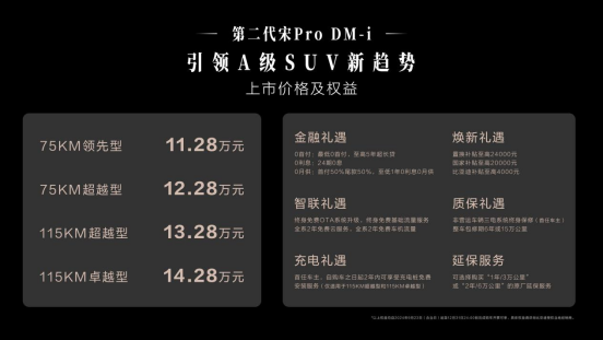 A级SUV冠军全面进化,第二代宋Pro DM-i焕新上市,新车共推出4款车型,官方指导价11.28万元-14.28万元。新车搭载比亚迪第五代DM技术,百公里亏电油耗低至3.79L,创A级SUV新低,满油满电综合续航超1400km,以“大美智省值”的超强产品力引领A级SUV新趋势,成为主流务实家庭、年轻单身用户的购车首选。