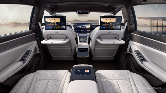 更重要的是,后排增配了双桌板,让后排成为应用场景丰富的多元空间,在商务场景下,它是便捷的移动办公区,方便用户处理文件、使用电脑办公,使出行与工作无缝衔接,展现专业性;对于家庭用户而言,它可以放置玩具、书本、食物,为家人孩子玩耍、阅读、进食带来了极大的便利。另外,爱美的女士们还能拿它当做临时化妆台,随时变美。后车窗电动遮阳帘支持一键升起和下降,不仅增强了隐私保护,同时也改善了后排的防晒条件,提供更加舒适的乘车环境,便利性和豪华质感俱佳。这些便利性配置不仅充满科技的想象和氛围感,同时也更能满足商务接待等场景下的高端气质和便捷性需求。
