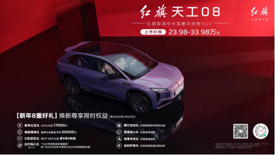 此次上市的红旗天工08,售价区间为23.98万元-33.98万元,共推出两驱和四驱2种驱动模式共5个版本供选择,充分满足了用户个性化的产品需求。同时,为充分彰显对于用户信任和支持的积极回馈,红旗品牌还将在2025年2月底前为红旗天工08的用户精心准备了涵盖0息轻松购、置换补贴、新年红包等在内的八重惊喜好礼,从而给予用户更加尊崇的礼遇,让用户轻松享有天工08所引领的智能豪华纯电出行新体验。