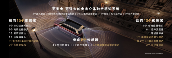 问界M9升级全向立体融合感知系统,新增3颗高精度固态激光雷达、3颗分布式4D毫米波雷达矩阵等感知硬件,实现对动静态目标(含异形物体)的全场景、全天候感知。问界M9在全向防碰撞能力基础上,面对雨雾尘天气,识别目视不可见车辆,自动紧急制动,规避碰撞风险;识别紧急变道、匝道汇入车辆,提前避让,规避碰撞风险;识别车辆前后夹击风险,自动紧急避让;主动规避消防箱、充电桩、风机管、低矮路沿、沟渠、台阶等磕碰风险。问界M9拥有制动、转向、通信、感知、供电核心领域双倍配置的冗余安全设计,用双保险筑牢安全防线。