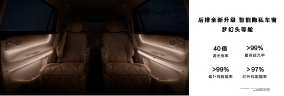 问界M9两侧后排升级智能隐私车窗,4档透光度可调,支持门板物理旋钮、语音等多种调节方式,实现看得见风景,守得住隐私的领先体验。创新暮夜空间,关闭遮阳帘、车窗,智能隐私车窗调至最暗、打开幕布,关闭氛围灯、阅读灯,一键进入隐私、休憩时刻。
