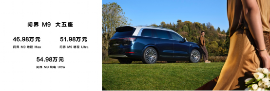 问界M9增程版搭载更高效的增程系统,拥有行业领先的44.8%量产热效率,配合智能增程技术,CLTC综合续航高达1474km(标配52kWh电池),CLTC纯电续航达到290km。