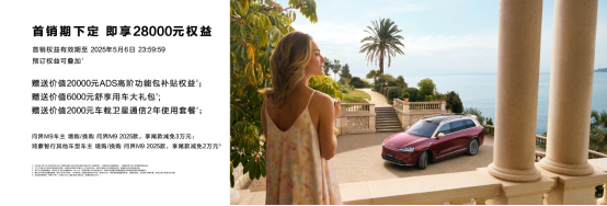 首销期即刻下定,赠送价值20000元ADS高阶功能包补贴权益;赠送价值6000元舒享用车大礼包;赠送价值2000元车载卫星通信2年使用套餐;问界M9车主增购/换购问界M9,享尾款减免3万元;鸿蒙智行其他车型车主增购/换购问界M9,享尾款减免2万元;首销权益有效期至2025年5月6日23:59:59,预订权益可叠加。