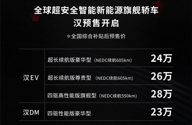 汉不仅是一款产品,更是一份荣耀。过去几年,比亚迪王朝系列车型不断推出,在产品品质上有了质的飞跃。作为全新旗舰车型,汉从一开始就以“全面均衡领先、全生命周期安全”为目标进行开发,集比亚迪十余年新能源车研发经验与一身,采用全球顶尖造车技术,是一款真正豪华、真正安全、真正长续航的新能源车。