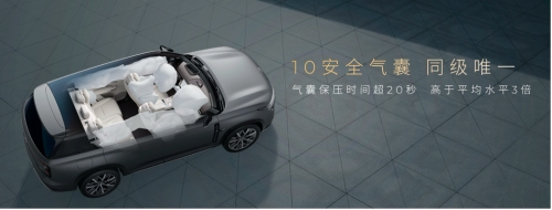 此外,同级最多10个安全气囊,不仅包含20L超大膝部气囊,还有超长20秒保压安全气帘,保压时间超同级3倍,对乘员持续提供安全保护。