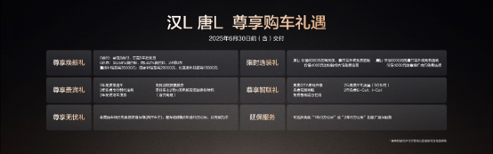 伴随汉L唐L的上市,比亚迪王朝网还准备了七重购车礼遇。截至6月30日24:00前完成购车开票,用户可享尊享金融礼,0首付、0利息任选其一;尊享置换礼,置换补贴至高35000元;还有尊享无忧礼、尊享贵宾礼、尊享智联礼、延保服务可选。