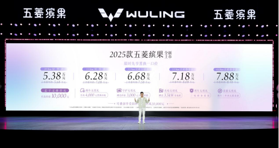 2025款五菱缤果共推出203km轻享款、333km悦享款、333km灵犀互联款、333km灵犀尊享款及410km灵犀尊享款五款配置可供选择,官方指导价为5.68万-8.48万元,为庆祝五菱缤果家族销量突破五十万,特推出感恩回馈:购2025款五菱缤果可享限时先享置换一口价5.38万-7.88万元。此外,五菱官方推出至高价值10,000元的“孟子义推荐礼”,包括购车无忧礼:至高4,000元置换补贴;守护无忧礼:赠送价值3,000元3M太阳膜;充电无忧礼:赠送3.5kW充电桩;用车无忧礼:三电终身质保;流量无忧礼:购车后享受三年无限流量;此外还可叠加享受至高20,000元的国家/地方补贴。广大用户可通过五菱汽车APP/小程序等线上渠道下订。