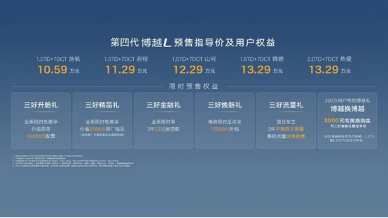 2025年4月22日,“三好SUV”第四代博越L正式开启预售,新车共推出扬帆版、启程版、山河版、锦绣版、热爱版5个版型,预售指导价10.59-13.29万元。作为好看、好开、好智能的新一代“三好”SUV,第四代博越L为超越用户期待而来,采用超越期待的新一代匠心设计、超越期待的新一代智能座舱、超越期待的新一代数字驾控、超越期待的新一代舒享空间、超越期待的新一代驾乘安全,开启燃油车AI平权的新时代。同时,新车不仅以50多项全系标配实现“入门即高配”,更以24项同级独有、26项同级领先优势,成为10万级燃油SUV价值天花板。