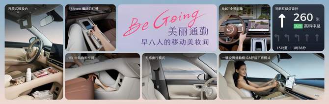 针对职场女性的通勤场景,缤果S贴心打造兼具美感与松弛感的移动空间。上车系好安全带,车辆自动开启空调及预设的通勤导航,直达公司;下班一键切换舒适回家模式,空调与回家路线同步就绪,红绿灯读秒、540°全景影像让行车停车得心应手。贴心的开放式补妆梳妆台、175mm专属口红槽、化妆镜与补光灯等,通勤路上随时保持精致状态。15L中岛妆柜巧妙设计分层空间,包包、高跟鞋都能轻松收纳。