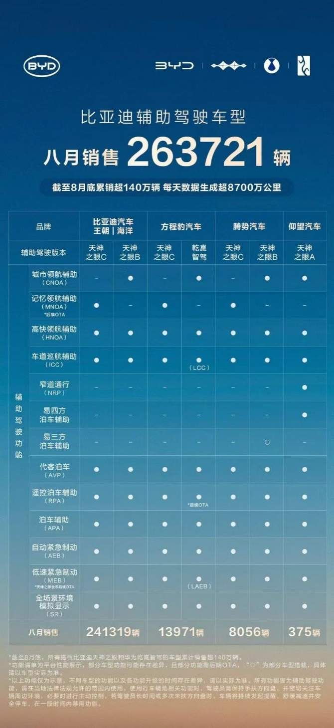 销量的持续增长,背后是强大技术实力与产品的支撑。近年来,比亚迪“技术护城河”持续拓宽。年初发布的“天神之眼”辅助驾驶系统,搭载车型累计销量已超140万辆,8月辅助驾驶车型国内销量占比达90%,每天生成的辅助驾驶数据里程超8700万公里。