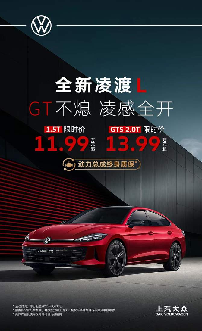 让人惊喜的是,这款“高颜值德系A+级轿跑”全新凌渡L,其价格区间为11.99-15.59万元,11.99万元的起步价还是性价比很高的。备受性能玩家青睐的GTS车型,以13.99万元起即可让消费者享受到2.0T高功率发动机带来的纯粹驾驶乐趣。同步还推出动力总成终身质保、置换或金融权益礼等惊喜购车权益,助力年轻人轻松入手个性座驾。