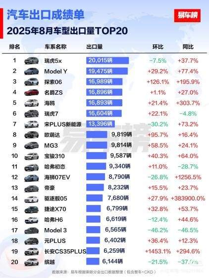 图4:1-8月车型出口排行榜,比亚迪宋Plus新能源独占鳌头