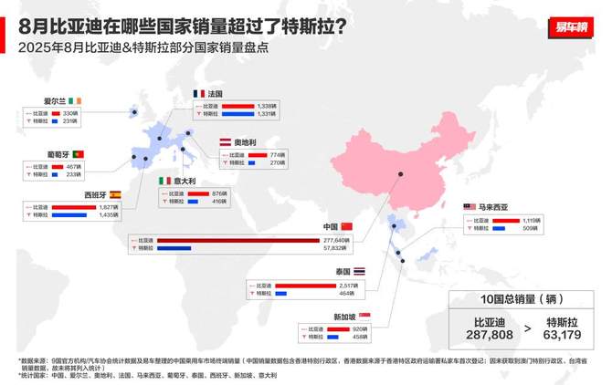 根据易车最新数据显示,8月,比亚迪在西班牙、法国、意大利、爱尔兰、葡萄牙、奥地利、新加坡、泰国、马来西亚等国家销量均超越了特斯拉,在欧洲以及东南亚市场均呈现强劲增长态势:其中,法国8月单月销量达1338辆,同比激增792%;而西班牙市场则以1827辆的销量成绩,实现同比增长414.6%。这种多点开花的市场表现,不仅说明了比亚迪全球化战略的有效性,更以实际数据印证了比亚迪在国际市场的竞争力。